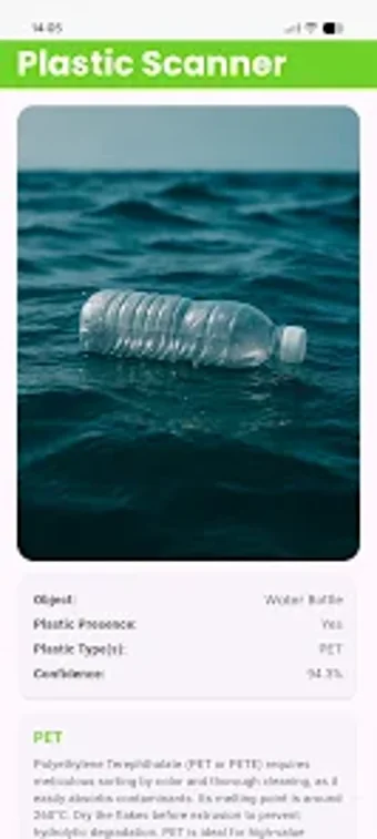 Plastic Scanner é um aplicativo móvel desenvolvido para facilitar a identificação e reciclagem de plásticos, utilizando tecnologia de reconhecimento de imagem. Através de uma simples foto, o usuário pode identificar diversos tipos de plásticos, como PET, HDPE e PVC, recebendo orientações sobre como descartá-los corretamente. Com uma interface amigável, o app é ideal para uso cotidiano, promovendo práticas sustentáveis e conscientização ambiental.
